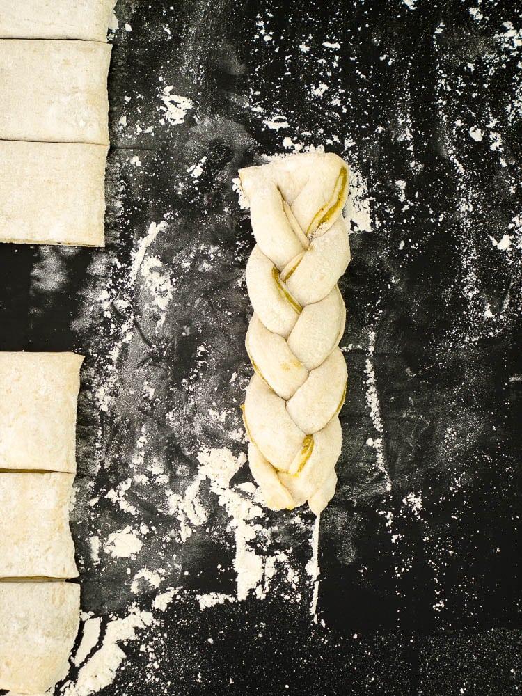 Nun den Teig von der langen Seite her in acht breite Streifen teilen. Jeden dieser Streifen jeweils in drei Streifen teilen, an einer Seite nicht ganz durchtrennen.