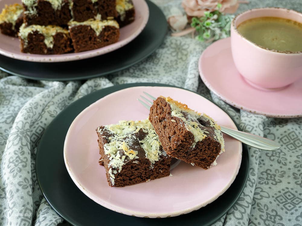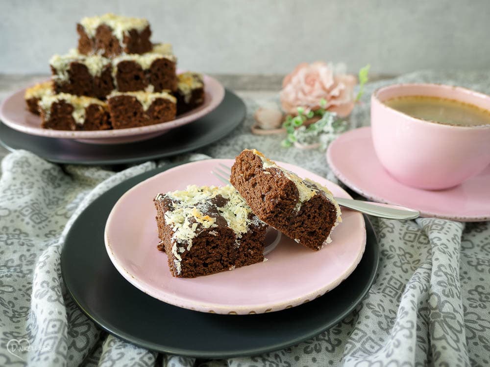 Saftiger, schokoladiger Hefeteig trifft Kokos! Hammergeil! Hammer Kombi! Butterkuchen völlig neu interpretiert. Den müsst ihr einfach ausprobieren!