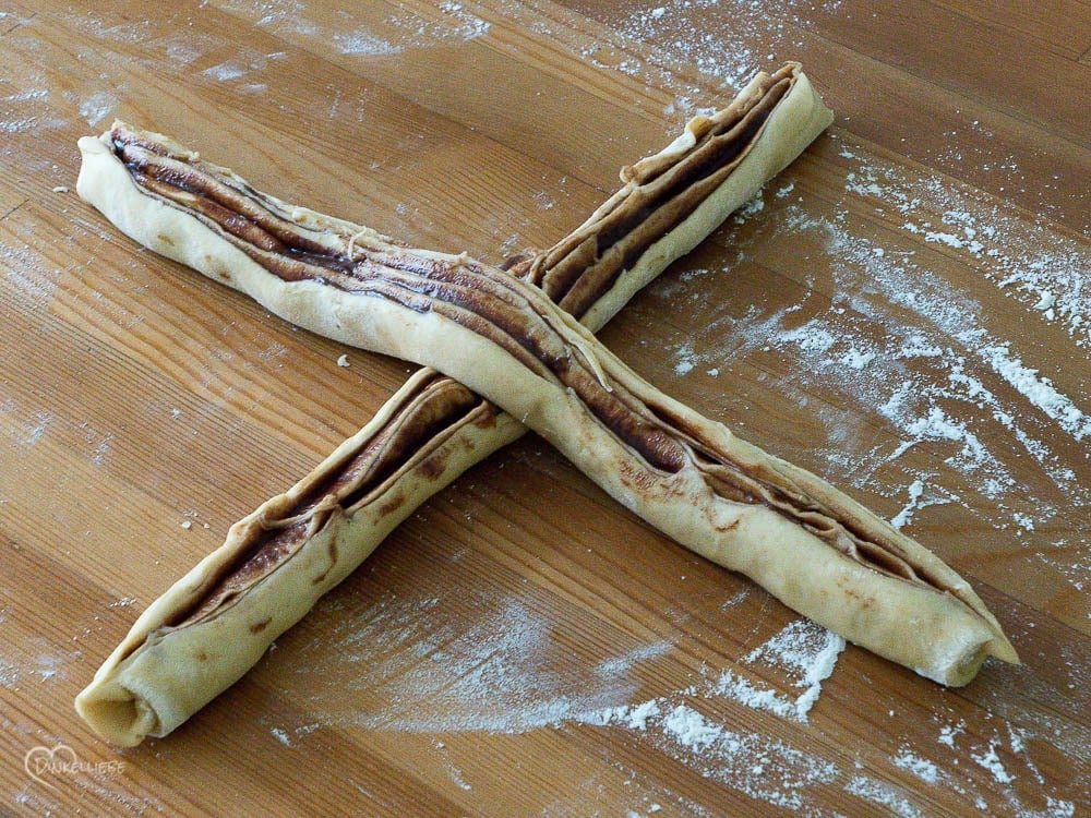 Die Rolle der Länge nach in der Mitte durchschneiden. Die Schnittflächen nach oben drehen und die beiden Stränge über Kreuz legen.