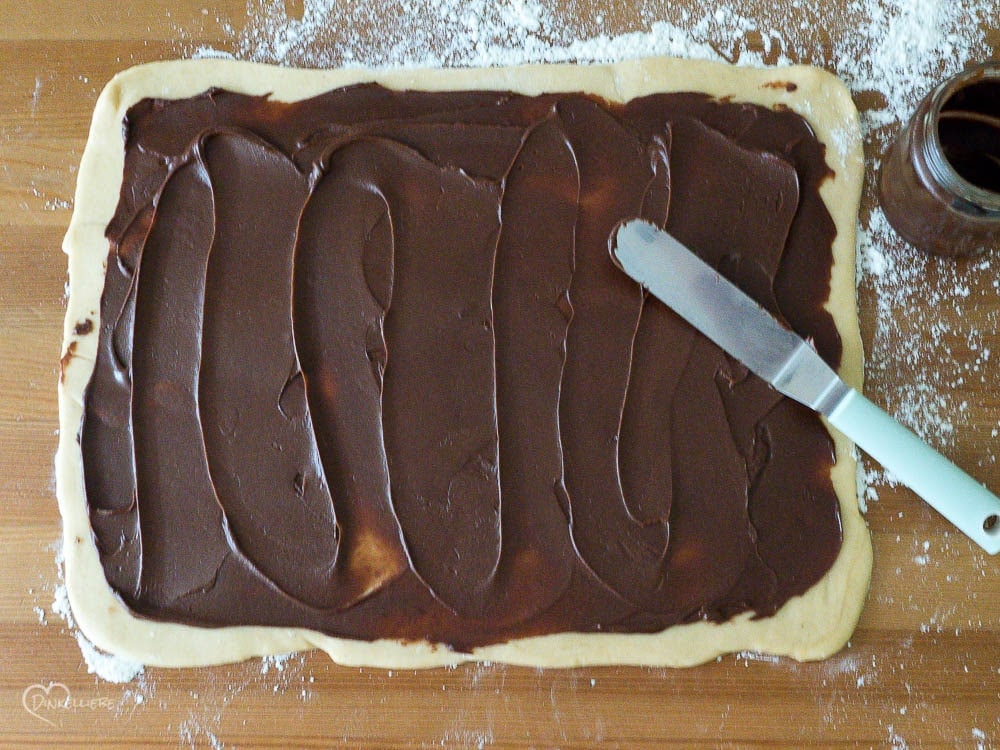 Den Teig nach der kalten Gare 60 min bei 21 Grad akklimatisieren lassen. Danach auf die gut bemehlte Arbeitsplatte geben und zu einem Rechteck von etwa 4-5 mm Dicke ausrollen. Die Nougatcreme gleichmäßig darauf streichen und dabei ringsherum einen kleinen Rand frei lassen.